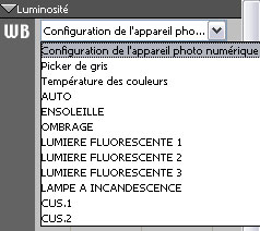 Le paramètrage de la balance des blancs offre beaucoup de choix. En premier on retrouve l'utilisation de la configuration du S3 lors de la prise de vue. En second dans liste, vous avez le "Picker de gris". Dans ce mode, réglez la balance des gris en utilisant l'icône du verseur de gouttes pour spécifier un point gris dans l'image. (Si les nuances de couleur ont été régles séparément pour R, V et B, la balance des gris n'est pas réglée correctement). Le troisième choix correspond au réglage manuel. Ensuite vous avez le mode AUTO qui dans l'ensemble est très efficace. En cinquième choix c'est le mode "Ensoleillé" qui donne une couleur de lumière plus froide et en sixième le mode ombrage pour une lumière plus chaude. Les 4 choix suivant ,Fluo 1, 2 et 3, puis incandescente, sont destiné à la photo en intérieur avec lumière artificielle. Les 2 derniers modes seront pour vos balances des blancs personnelles. Pour pouvoir les utiliser au développement du RAW, il faut bien sur les avoir enregistrées lors de la prise de vue.