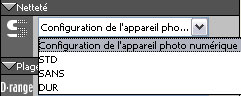 Lors de la génération de la photo, il est possible d'agir sur la netteté. Comme toujours en premier on retrouve l'utilisation de la configuration du S3 lors de la prise de vue. Ensuite la liste propose une amélioration de la netteté standard. Vous pouvez également choisir de ne pas améliorer la netteté, ou au contraire, de l'accentuer fortement.
